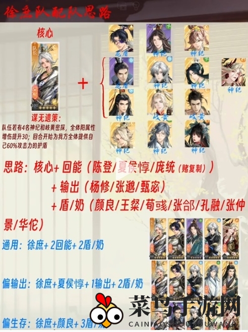 倾向生存阵容:以徐庶为基础,联合颜良,配备三位防御/治疗型武将,确保队伍的持久战斗力。