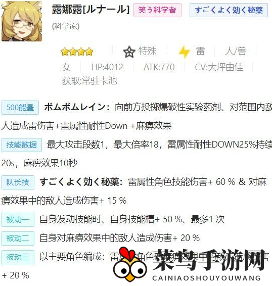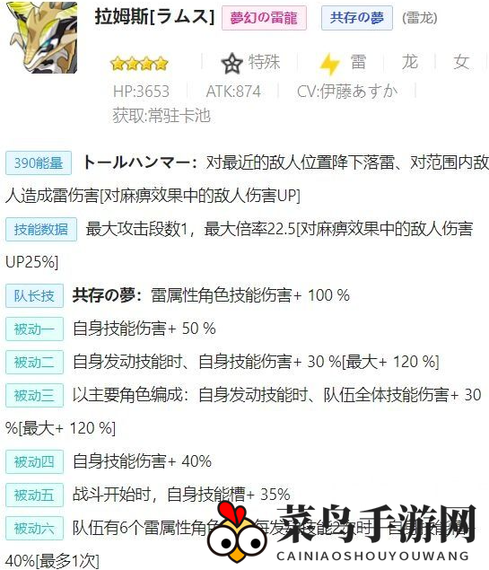 拥有麻痹和控制,以及降低雷耐性的辅助能力,还有一次50%的回充,即使在日服也是雷属性辅助中的常客。