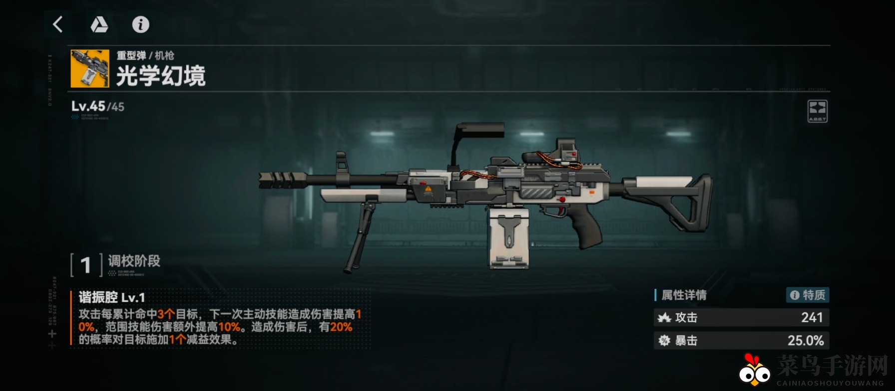 潜入《少女前线2:追放》的武器宝库,你将邂逅形形色色的枪械,每一把都散发着独特魅力。在这众多枪械中,光学幻境这款橙色重型弹机枪无疑是焦点中的焦点。它不仅是佩里缇亚的专属武装,还因其独树一帜的属性效果在玩家圈子里收获了无数目光。今天,我们就来揭开光学幻境的神秘面纱,一探其奥秘所在。