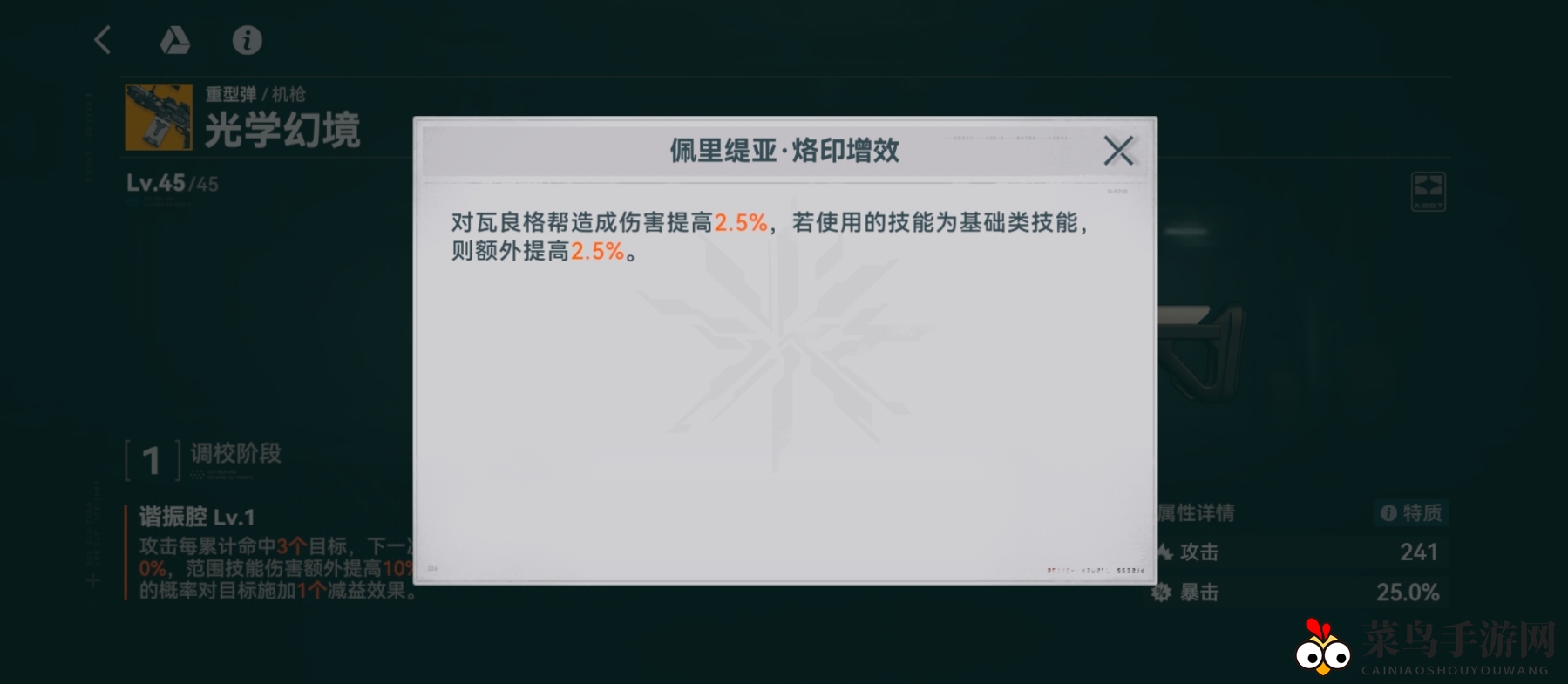 佩里缇亚·烙印加成:对瓦良格帮造成伤害提高2.5%。若使用的技能为基础类技能,则额外提高2.5%。