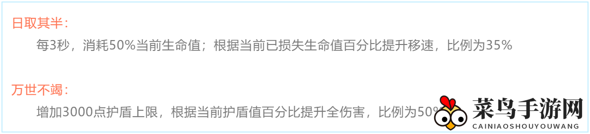 增伤效果的计算方式与日取其半类似,但以护盾百分比作为计算对象,同时增强了角色的生存能力。