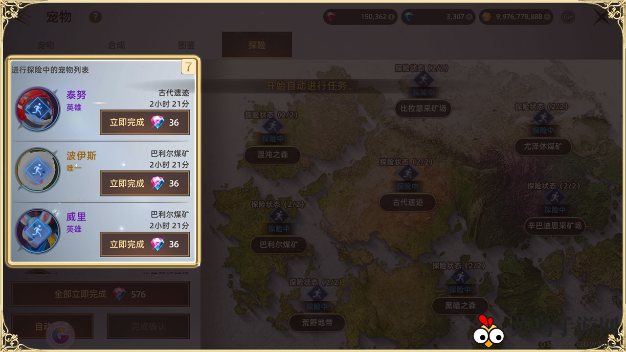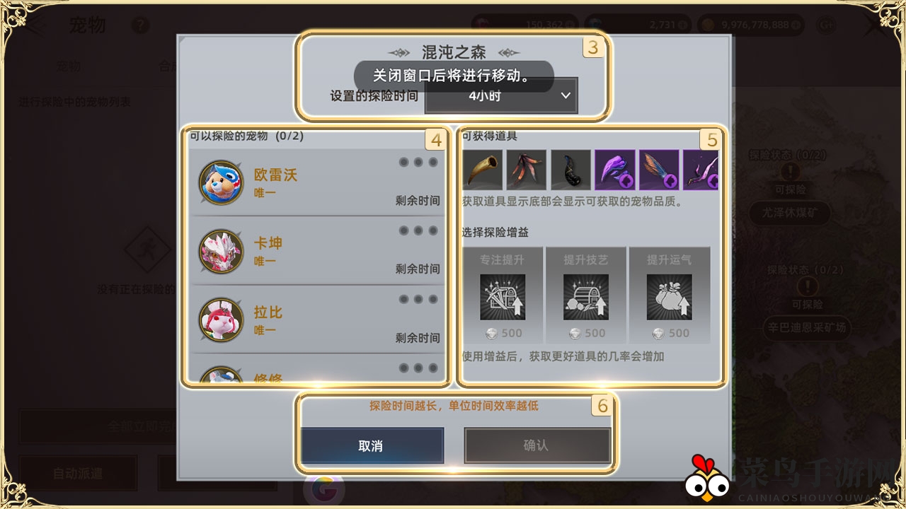 ●确认派遣宠物和增益效果后,点击确定开始探索;