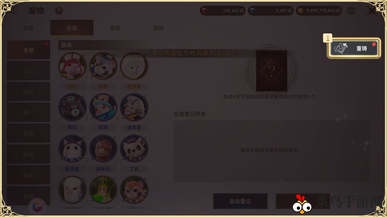 合成出英雄级或以上品质宠物时,选择宠物重铸,提升宠物品质。