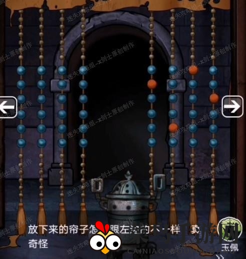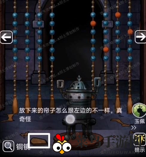 4、前往右侧场景,拉动绑着卷帘的绳子,完成小游戏后获得绳子,并收到密码提示。