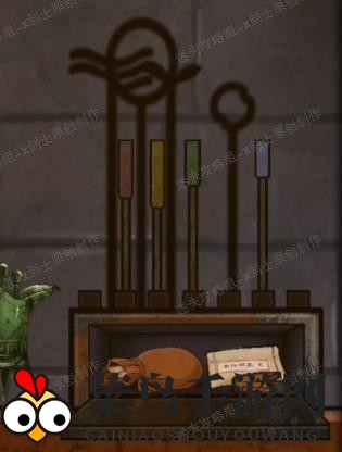 15、回到屏风前面,点击桌子,将四个签子放到正确位置,如图所示。