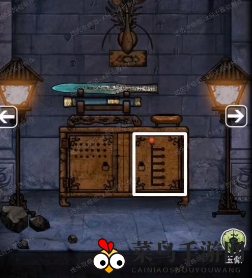 5、回到放置青铜剑的地方,点击下方小球球进行挂挡,挂的位置为2512,柜子将完全打开。