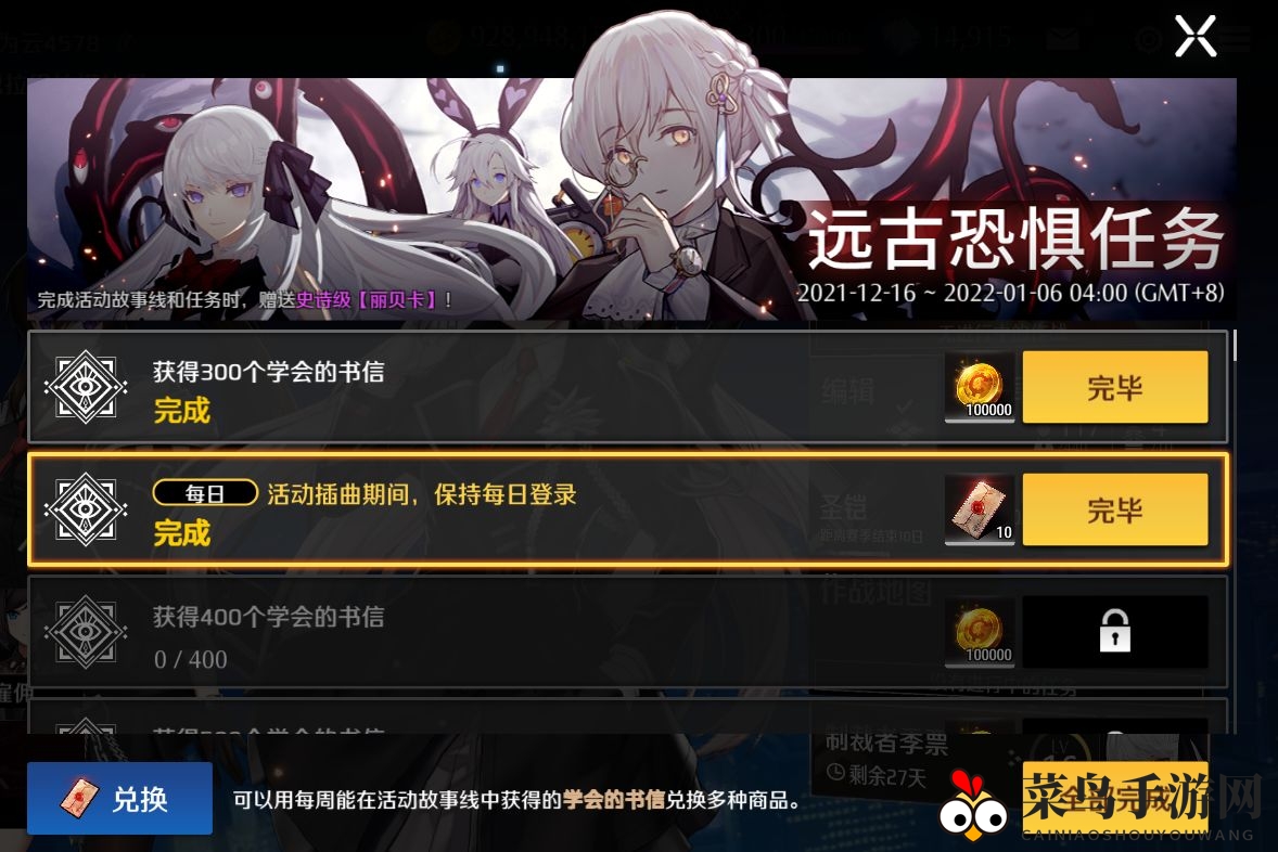 ESPR特设剧情和“远古恐惧”活动自本周维护更新后同步上线。成功挑战活动关卡并完成任务,玩家将有机会获得“学会的书信”道具,以及赢取SR“丽贝卡”。使用“学会的书信”可在活动商店兑换限量背景、新式舰船“高级轿车”、雇佣契约书和适能核等丰富奖励。