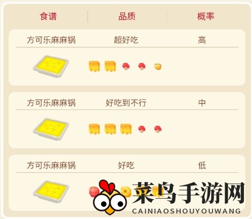 食谱、品质、成功率一览
