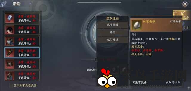 打造上衣、护腕、裤装,秘银蚕丝是核心。玩家可通过参与龙门绝境挑战、元宝商店抢购或直接在商行交易来入手。