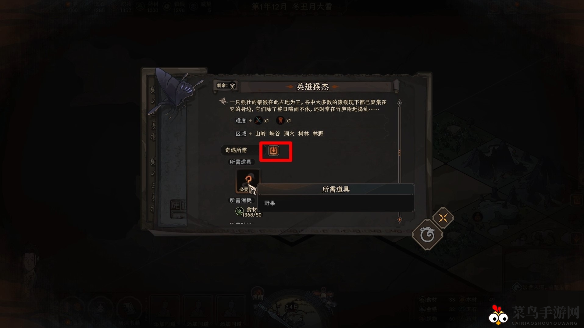继续前进,消耗【野果】探索地图,点击【奇遇所需】交付道具。