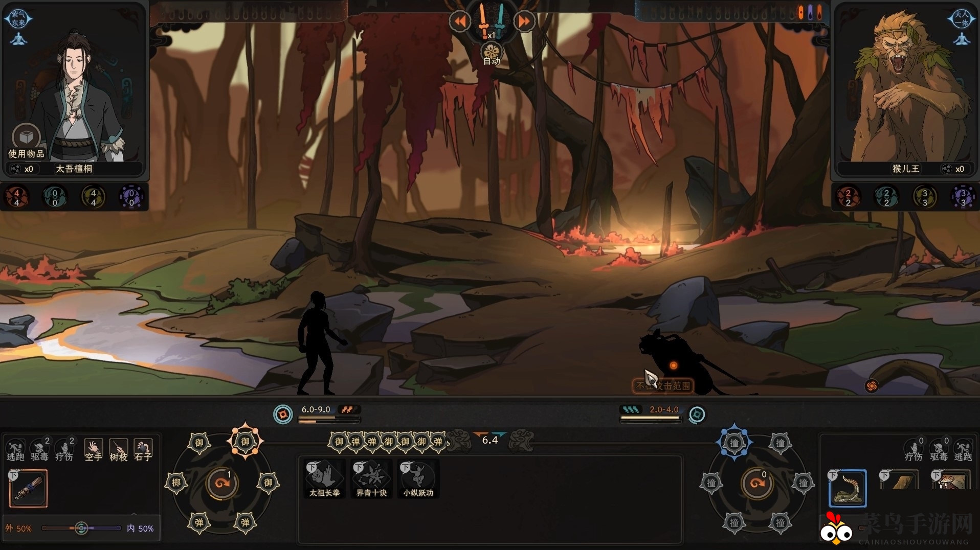 抵达后,准备应对猴王操控的木人袭击。消耗属性值躲避,属性越高,越能应对挑战。