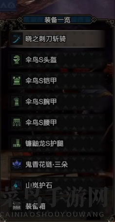 击败上位伞鸟后,制作晓之刺斩骑的太刀,搭配上位伞鸟S装备,纳刀术3技能必不可少。