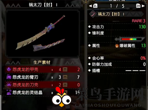 击败怨虎龙后,制作祸太刀,攻击力130,爆破属性,积累爆破属性后可造成巨大伤害。