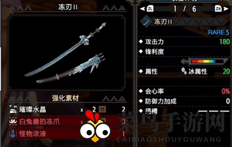 制作冰系武器冻刃2,冰属性20,攻击力180,制作简单,适合对付众多弱冰怪物。