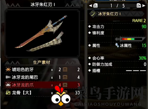 击败冰牙龙后,制作冰牙朱红刃,攻击力略逊于伞刺剑,但绿色斩味更高,会心率高,冰属性,适合对付弱冰怪物。