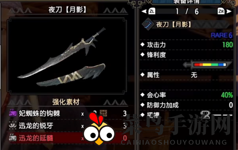 击败上位迅龙后,制作迅龙太刀夜刀【月影】,攻击力180,白色斩味,蓝斩高,会心率高。