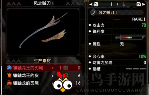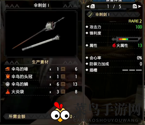 风之贼刀可以用来击败伞鸟,无需再制作其他太刀。击败伞鸟后,制作伞刺剑,攻击力100,火属性13,实用性强,需要破伞鸟头部。