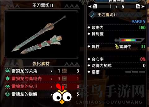 击败上位雷狼龙后,制作王刀雷切2,雷属性,适合对付弱雷怪物。