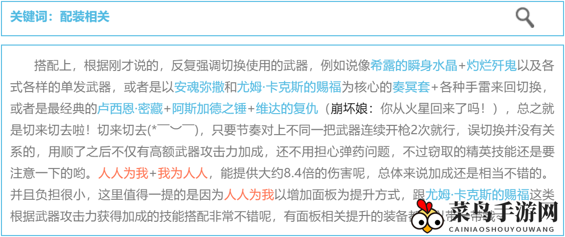 简单来说,切换武器后,全伤害将瞬间提升至120%,虽然持续时间较短,但频繁切换武器即可不断享受这一优势。这也使其非常适合喜欢频繁切换武器的玩家。