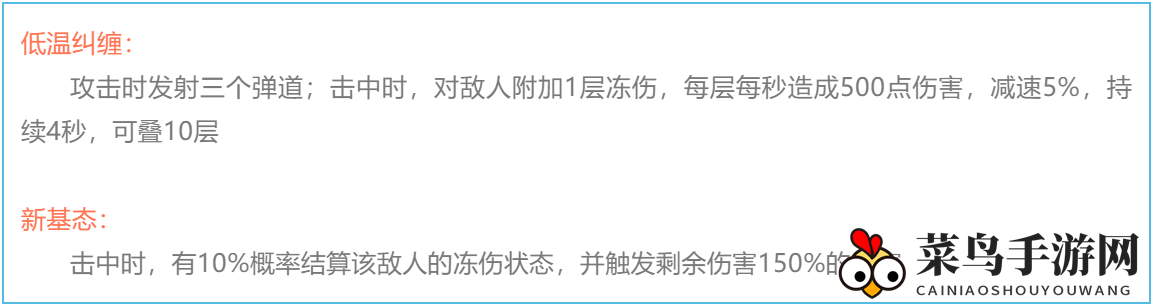 此技能有10%的概率在击中敌人时结算其冻伤状态,并触发150%的伤害加成。