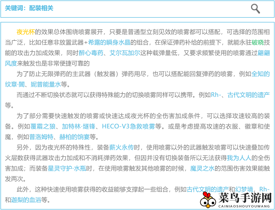 请注意,此加成条件为装备1件以上喷雾类武器,只有装备2件及以上时才能完全享受加成效果。