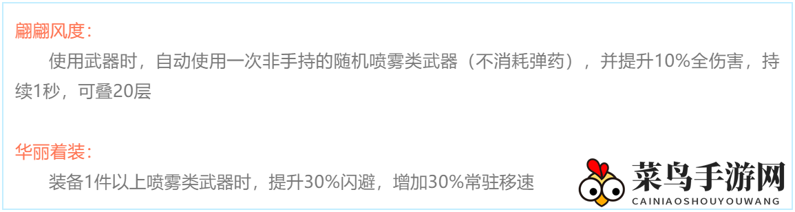 装备1件或以上喷雾类武器时,提升30%闪避率,并增加30%的常驻移动速度。