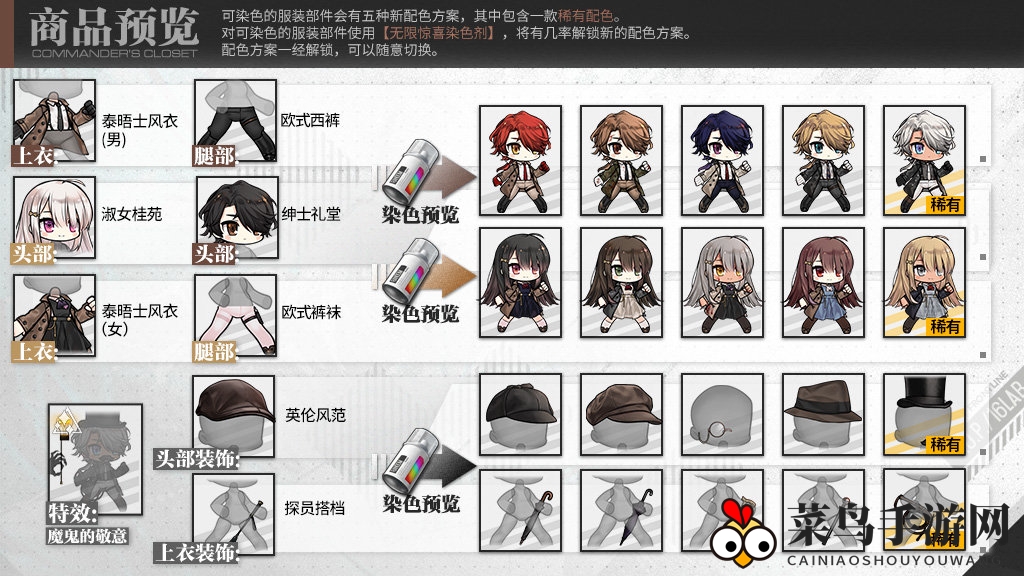 各位尊敬的指挥官,热切期待的指挥官侦探装“最后致意”将于4月15日维护更新后亮相服装商城。在5月12日23:59前抢购,更有八折优惠等你来体验!穿上这款指挥官装,解锁独特技能。借助“无限惊喜染色剂”,还能解锁更多个性色彩,集齐全套稀有配色,更有神秘特效等你探索!值得一提的是,指挥官服装特效现已独立于套装,指挥官们可随意搭配已收集的服装特效!