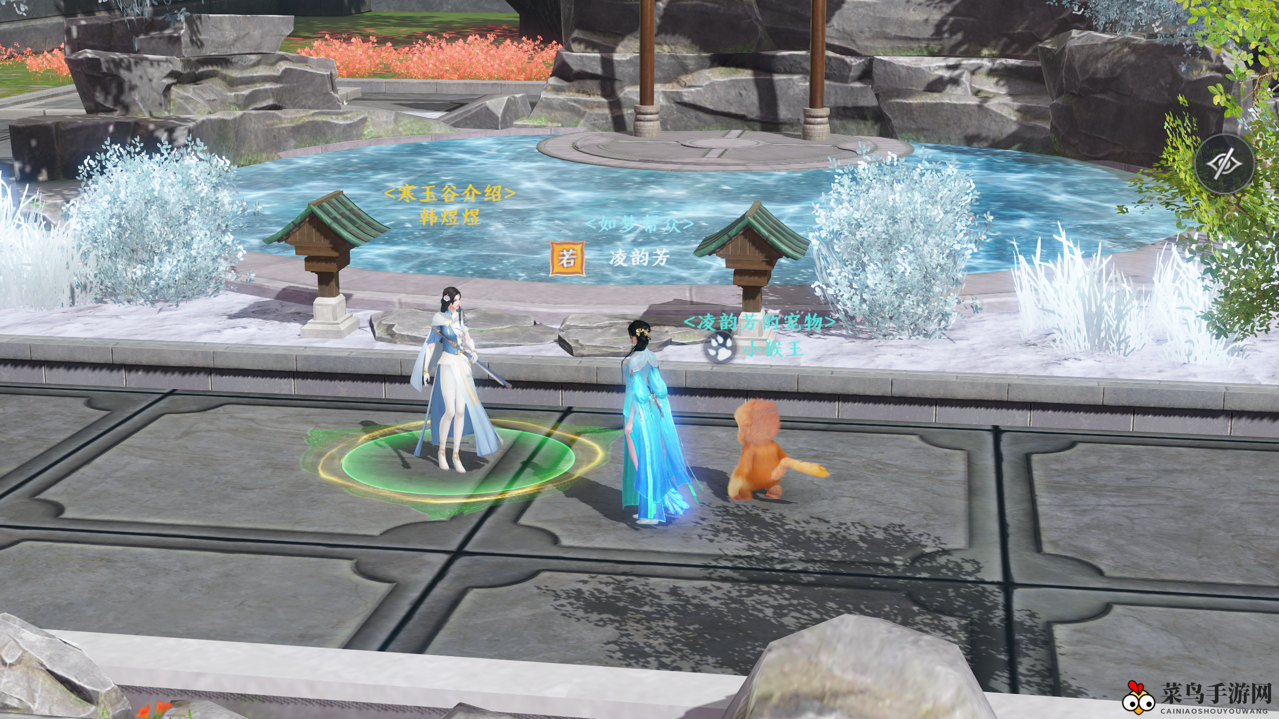 点击【前往活动】后,进入【帮会属地】,寻至【寒玉谷】建筑附近,与韩煜煜对话。