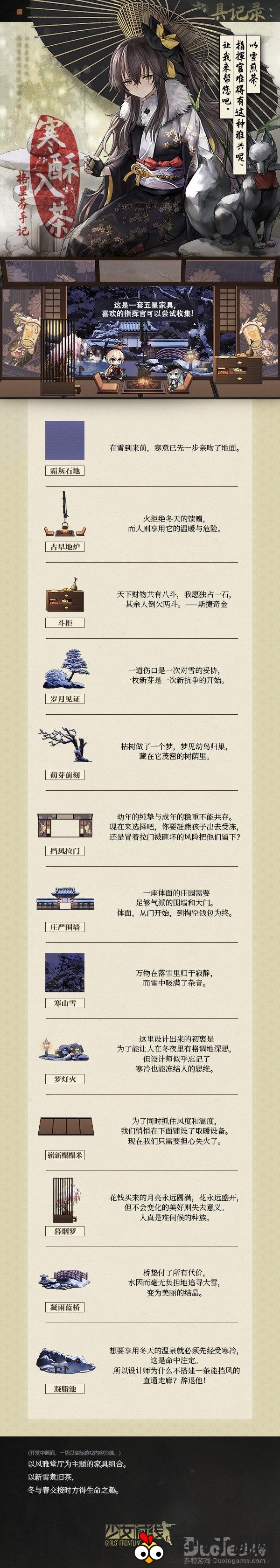 探索《少女前线》的无限可能,玩家们得以不断拓宽员工宿舍的版图,每一次的拓展都意味着战术人形间情感联结的加深。近日,官方重磅推出五星级别的新家具“寒酥入茶”,接下来,我们就来一探究竟,揭秘这款家具的独特魅力。