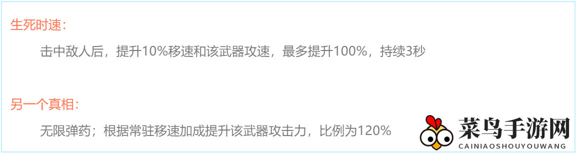 一击命中敌人,武器「东方快车」便能使自身移速和攻击速度提升10%,最高可达100%,此效果持续3秒钟。