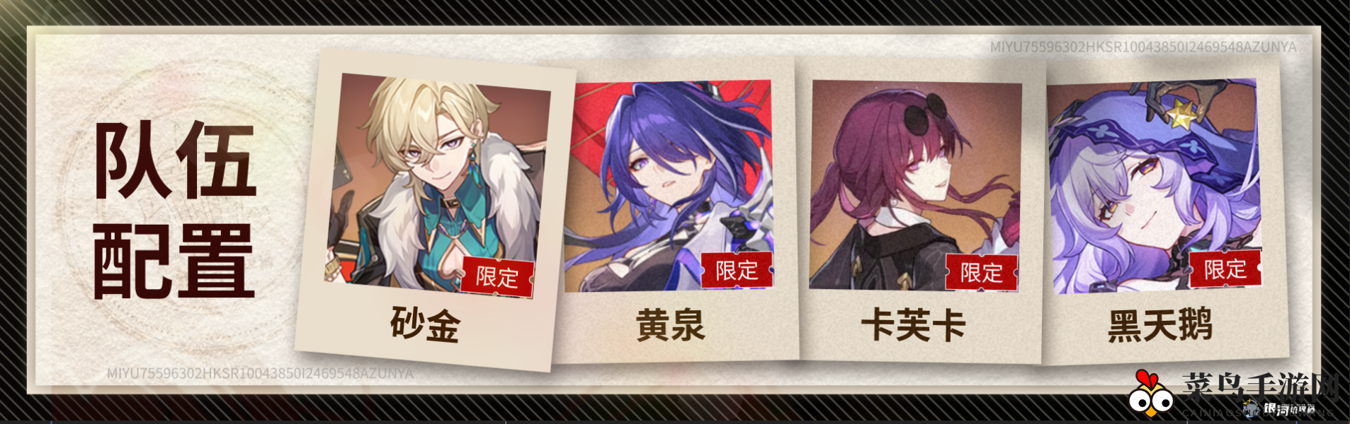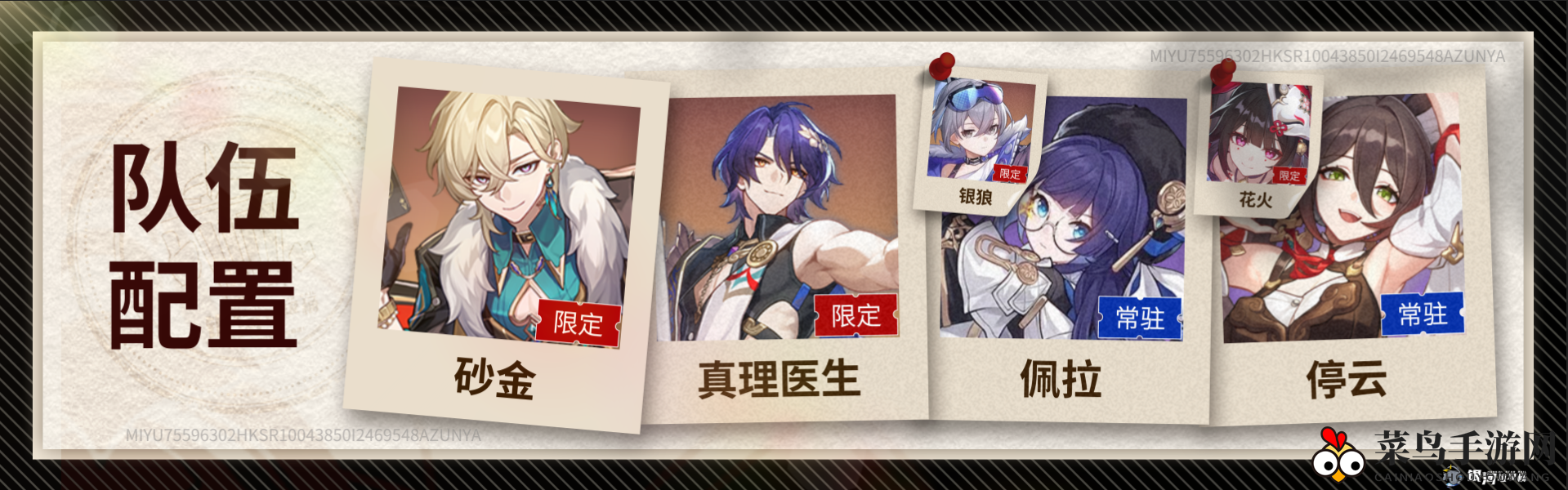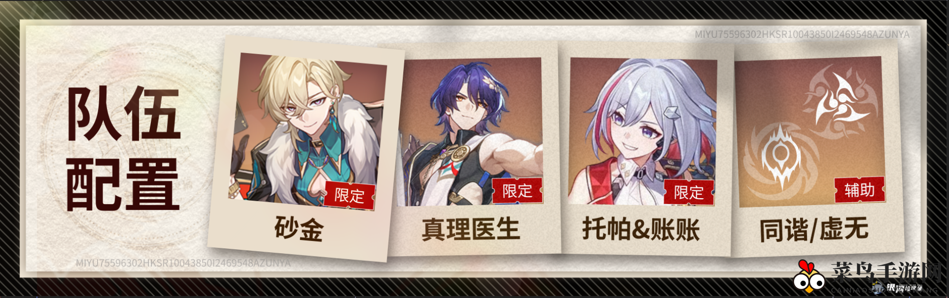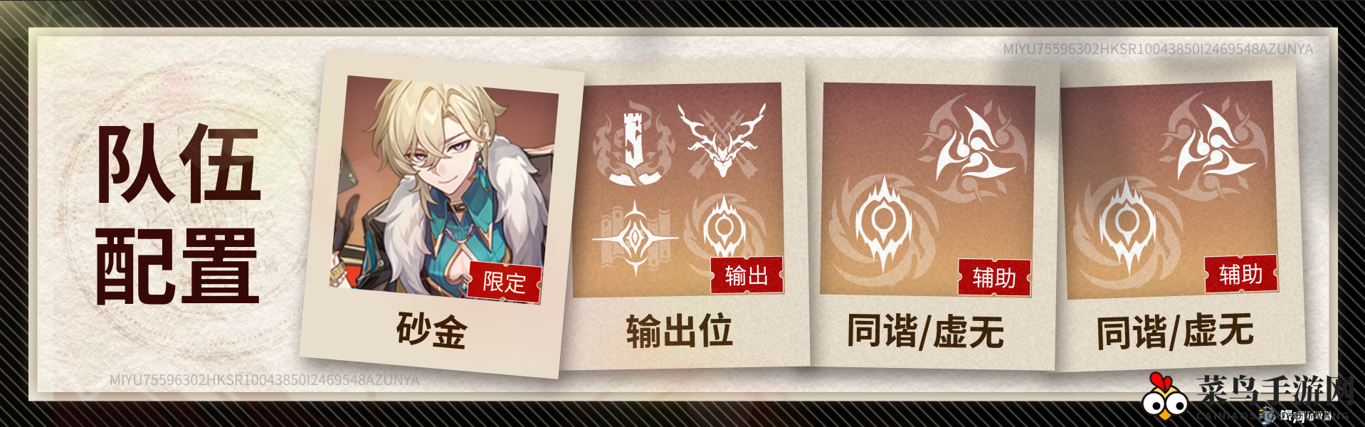 这种模式是典型的三辅助一输出配置,砂金作为存活的关键,其价值不言而喻。辅助位的搭配需根据输出位的特点灵活调整。