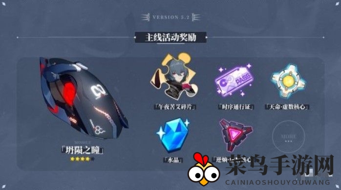 5.2版本期间,积极参与主线任务的玩家可领取4★重炮武器「坍陨之瞳」、「午夜苦艾」碎片、水晶等丰厚奖励,5.3至5.4版本还将推出更多奖励,敬请期待!