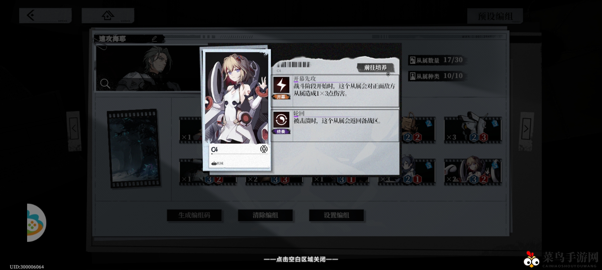 若对手没有上手,可用211喇叭配合标记解除盾牌防护,或用333冲锋车、332护盾车站场。若手牌机械充足,可选择『序列首席』211减费,并配合技能造成伤害。即便不利,也能用0费标记,再利用211增幅后的自行治安官站场并造成伤害。这些卡牌占卡组11/17,确保先手压制场面。