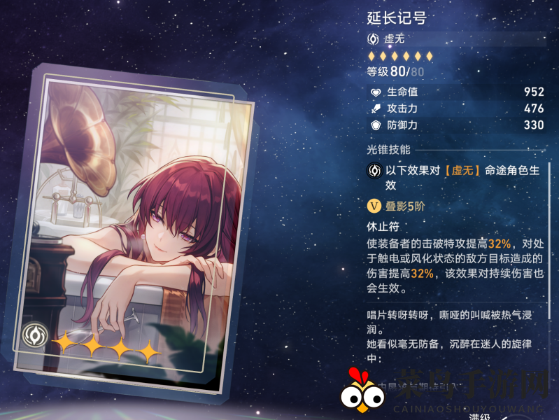 提升装备者击破特效16%/32%,对触电或风化敌人造成伤害提高16%/32%。特效1增加特殊状态伤害,特效2对风化和触电敌人伤害提升显著,适配角色为桑博。