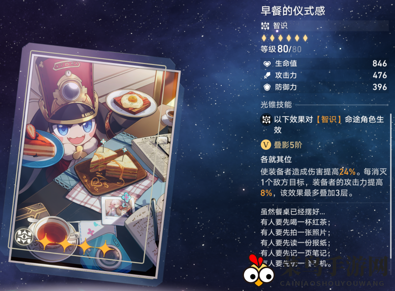 造成伤害提高12%/24%,每消灭一个敌人,攻击力提高4%/8%,最高叠加三层,适配所有智识角色。