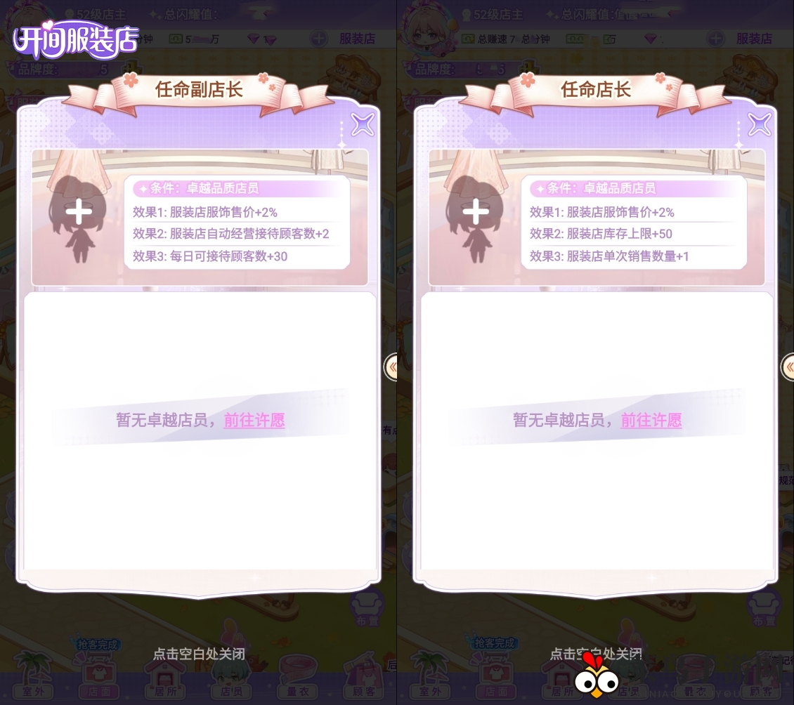 在《开间服装店》里,精英店员是主管的不二之选,而店长和副店长则需由顶尖店员担任。切记,不要在普通岗位人手不足时匆忙安排精英和顶尖店员,他们一旦上岗便难以替换,必须等到有普通店员接替才能进行调整。