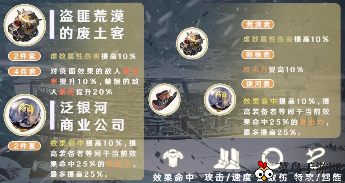瓦尔特的遗器搭配上,我们推荐【盗匪荒漠的废土客】四件套与【泛银河商业公司】二件套。这套搭配不仅能够增强瓦尔特的虚数属性伤害,还能在攻击处于负面状态的敌人时提升暴击率,攻击禁锢状态的敌人时增加暴击伤害,与瓦尔特的技能相得益彰;而【泛银河商业公司】二件套则能进一步强化瓦尔特的效果命中与攻击力。