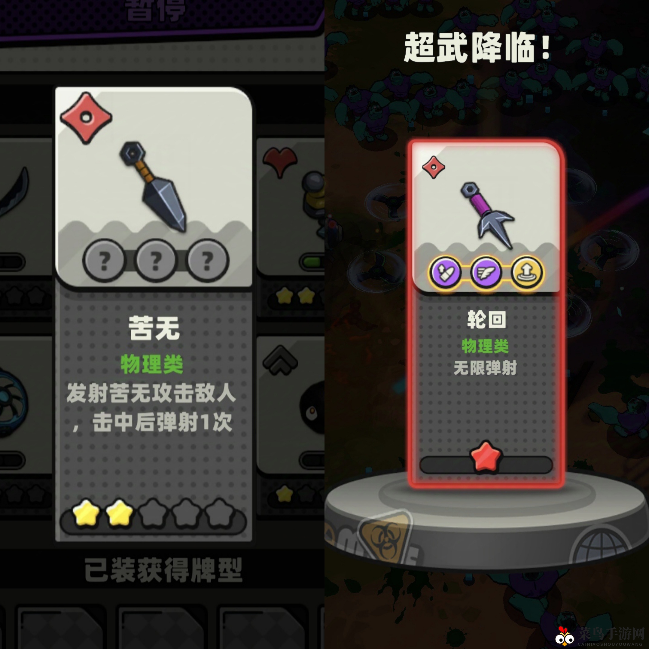 游戏体验:T1级武器战牌,适合中后期阶段,不考虑牌型时可根据个人喜好选择。虽然苦无拥有弹射特性,但不适合用于早期积累经验。在超武状态下,面对后期群怪战斗,其效果尤为显著。