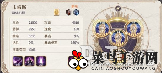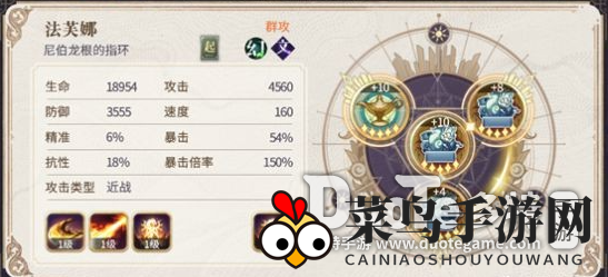 小贴士:法芙娜技能设置为111,契印属性为防御、生命、速度。卡俄斯技能设置为111,契印属性为精准、速度、防御、生命(提高精准度,以便挂上Debuff)。所有角色速度不可低于138,越高越好。对于新玩家来说,这套阵容练度要求低,非常适合。若契印属性不佳,可将金银岛技能升至5级。
