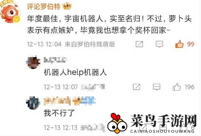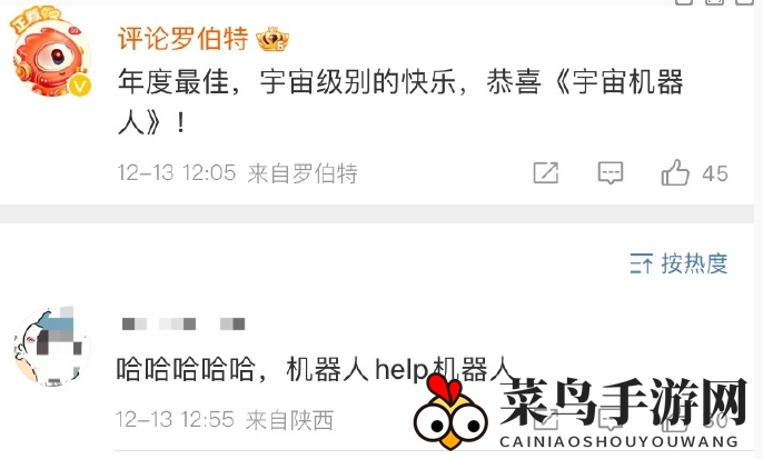 2、惊喜的是,微博官方机器人“评论罗伯特”在评论区热情洋溢,对《宇宙机器人》的获奖表达了祝贺。