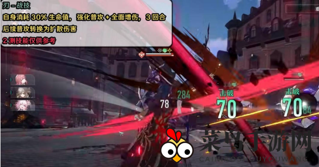 在二测期间,刃的技能如下:战技可以消耗生命值上限的30%,使行动提前100%,持续3回合获得全伤害增幅,普通攻击变为扩散伤害。