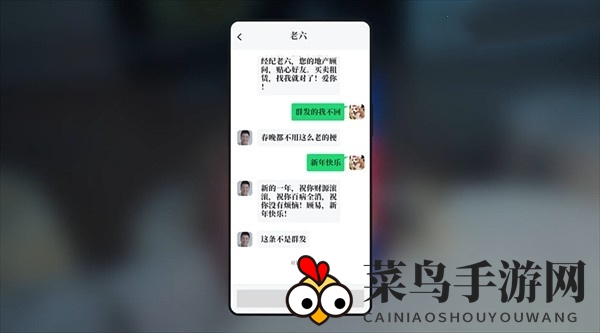 6. 在互动对话时,手机聊天内容均为等待画面,老六这里请选择“群发信息接收不到”-“新年快乐”。