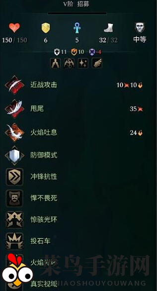 火焰吐息:攻击锥形范围内的所有单位,投石车破坏加固障碍,有90%的概率施加燃烧效果,持续3回合,倒计时2,魔法。