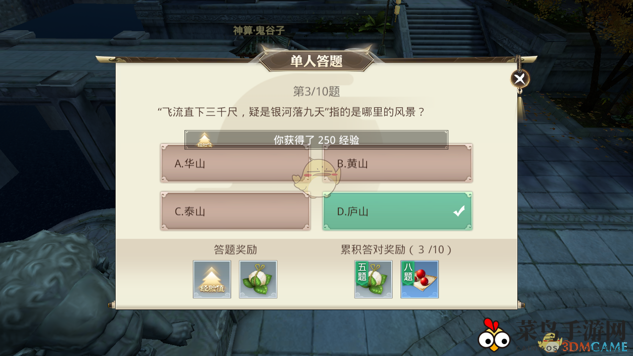 核心环节:在咸阳城(坐标:咸阳584,394)每日有10道知识问答题等你来挑战。正确回答将获得经验和道具奖励,连续答对5题和8题,还有额外的惊喜奖励等你来发现。
