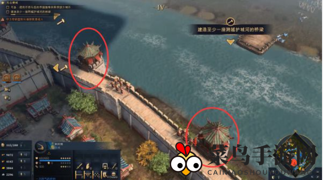 保持距离,炮楼防御坚固。先用回回炮摧毁炮楼,修复桥梁。
