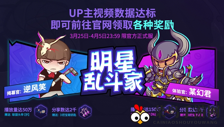 各位勇敢的探险者们,赶快前往官网,为我们的顶级UP主逆风笑、某幻君的视频点赞助威!只要他们的视频播放量和转发量达到指定标准,你就能登录官网后领取到乱斗会限定头带饰品、宝箱钥匙等丰厚奖励。不过,本次活动仅限已创建角色的官方正式服账号参与,若活动结束时数据未达标,则奖励将无法获得。