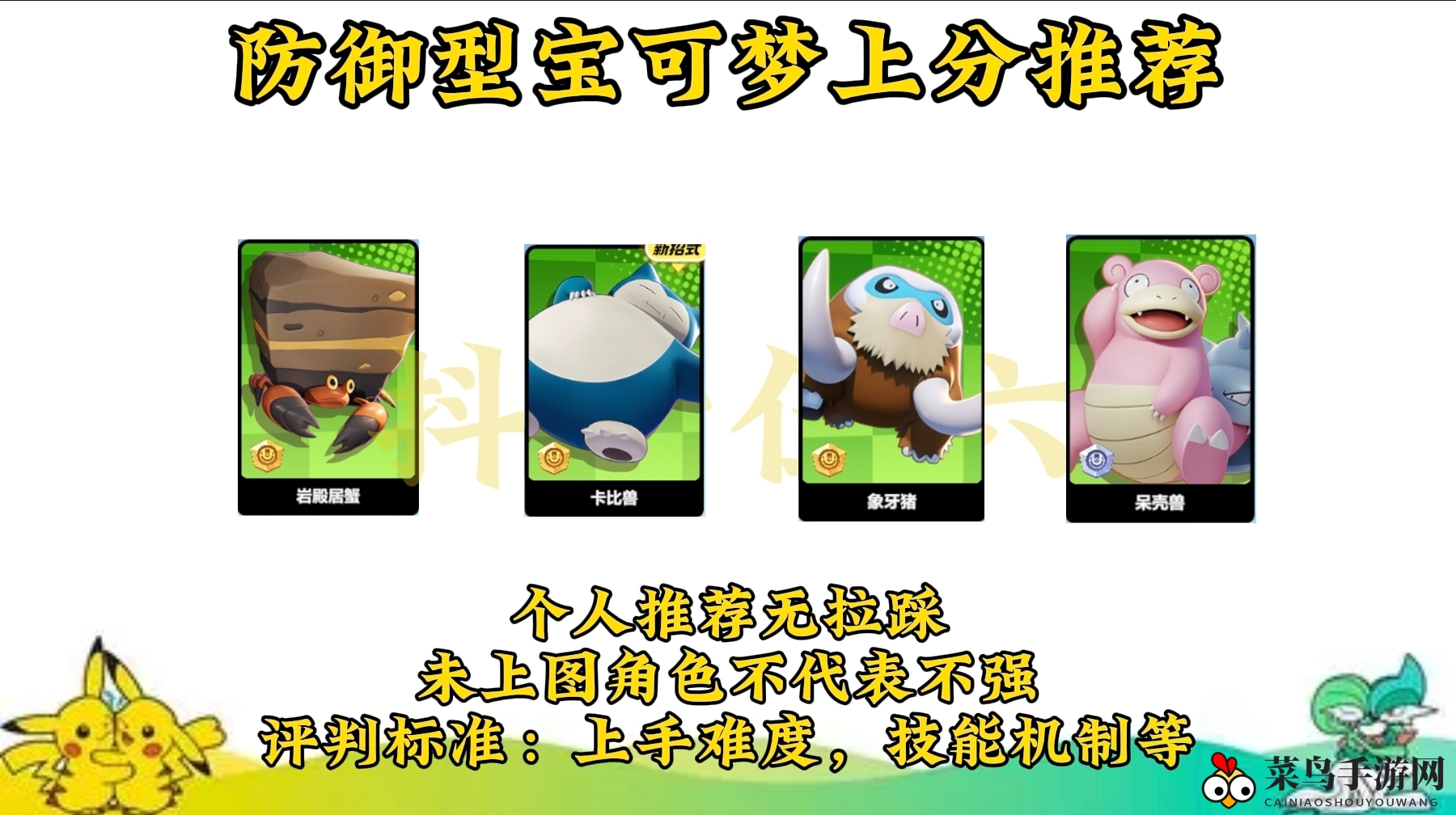 防御型宝可梦在控制方面表现卓越,同时拥有一定的伤害能力,个人推荐卡比兽。