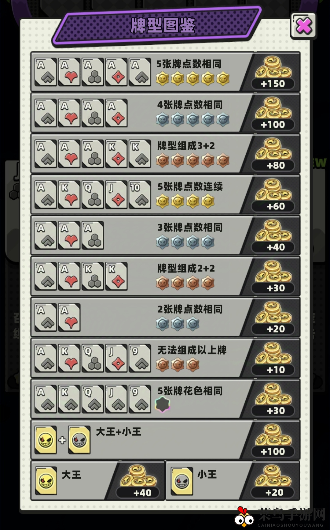 《库鲁启动》在保留经典割草肉鸽Ruglike卡牌三选一模式的基础上,巧妙融合了战牌机制。在挑选武器时,玩家需要综合考虑战牌组合,这种设计让游戏的可玩性与随机性得到了显著提升。选对牌型,还有机会赢得高达150金币的丰厚奖励。