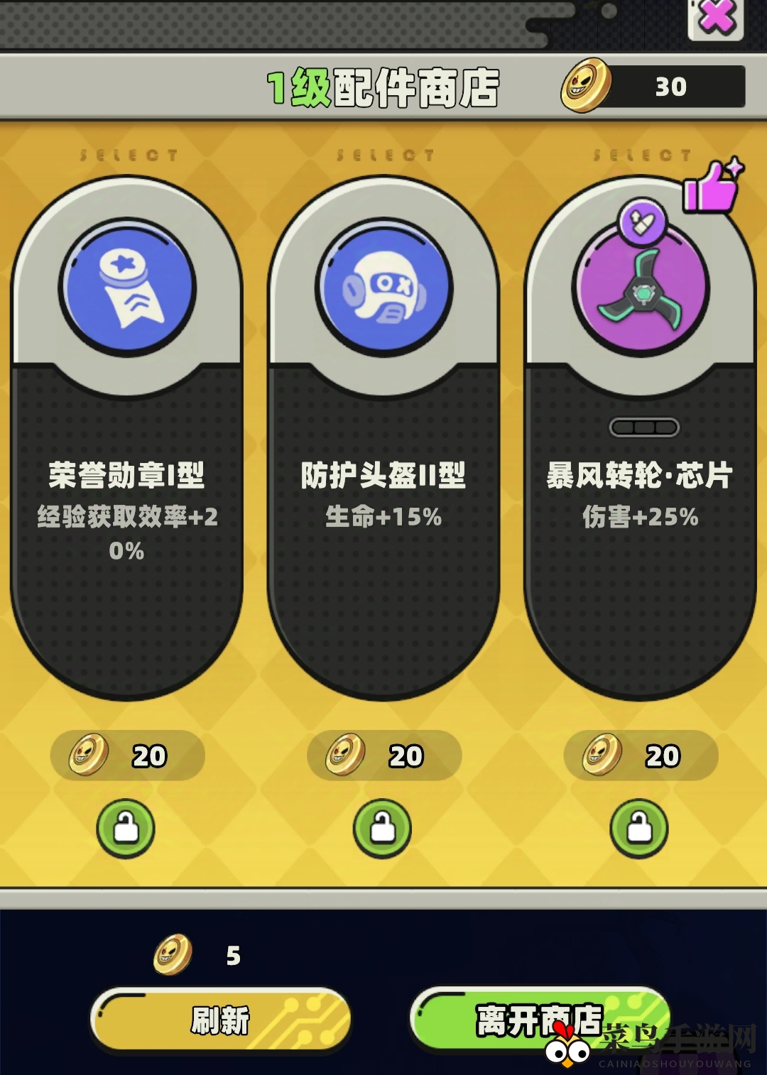 积累到金币后,玩家可以在商店购买武器配件和增强效果。集齐三件武器专属配件,即可解锁超级武器(简称超武)。如果能在初期打造出强力牌型,积累大量金币,轻松超越等级,战胜强敌将不再是梦。