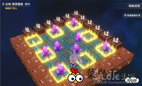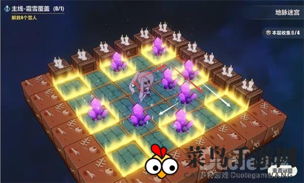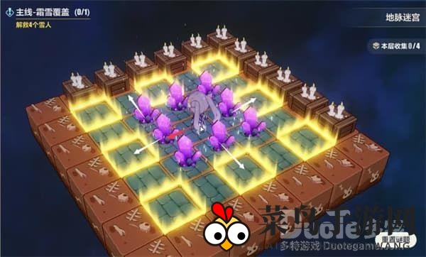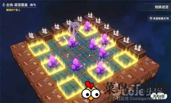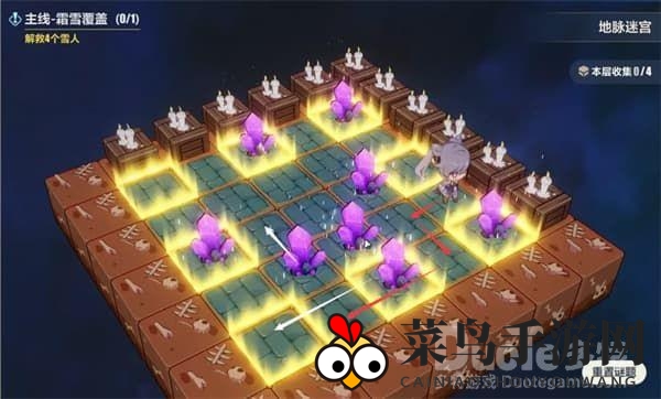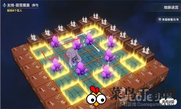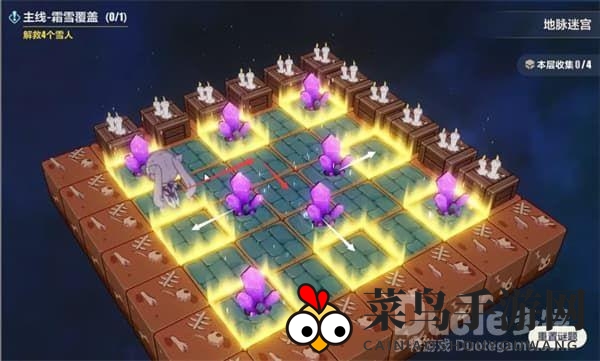 通过传送门来到这里,击败小怪、解救雪人等都不难,我们直接进入雪人身后的地脉迷宫,一共七步就能解开推箱子的谜题,注意以下步骤:白色箭头标识晶体移动路线,红色箭头标识人物移动路线,请按照我的步骤进行。